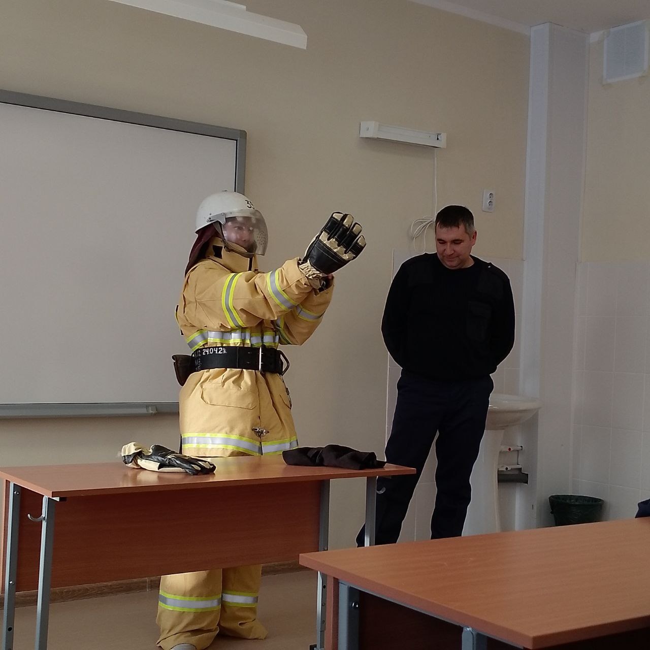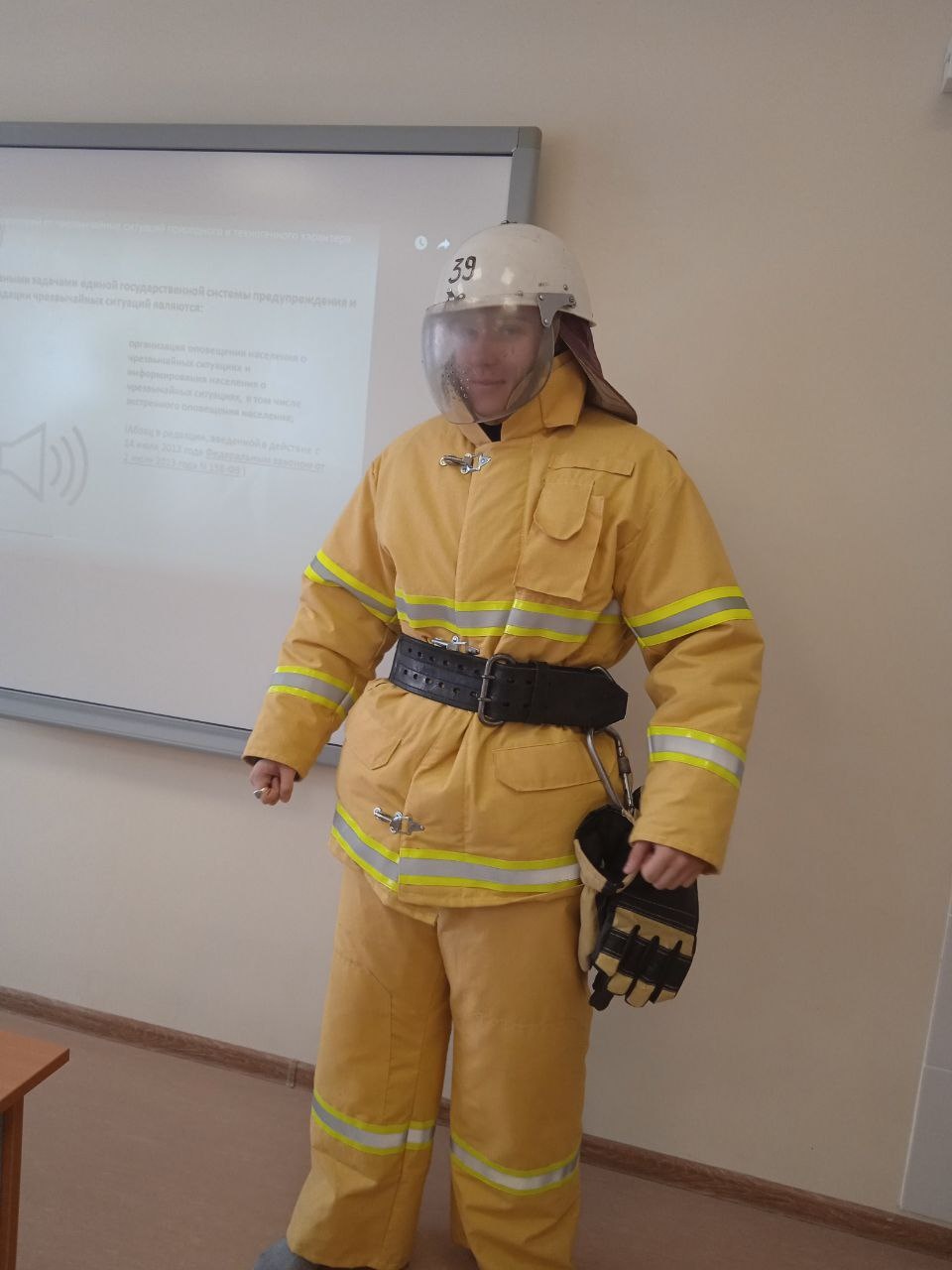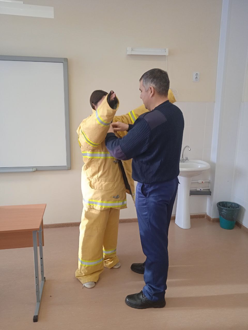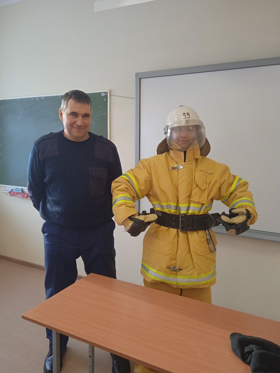 В гостях представители пожарной службы ПЧ-39. Старшеклассники вместе со специалистами чрезвычайного ведомства изучили как пользоваться первичными средствами пожаротушения и примерили экипировку пожарного.