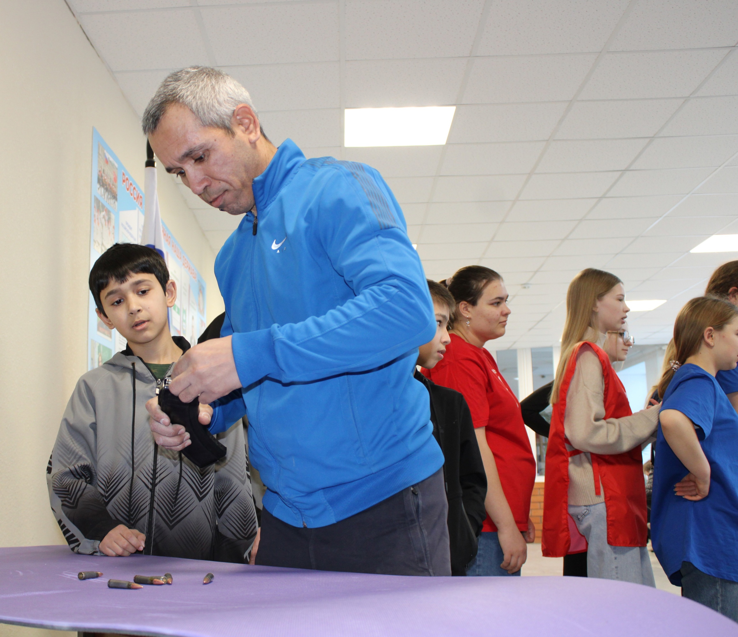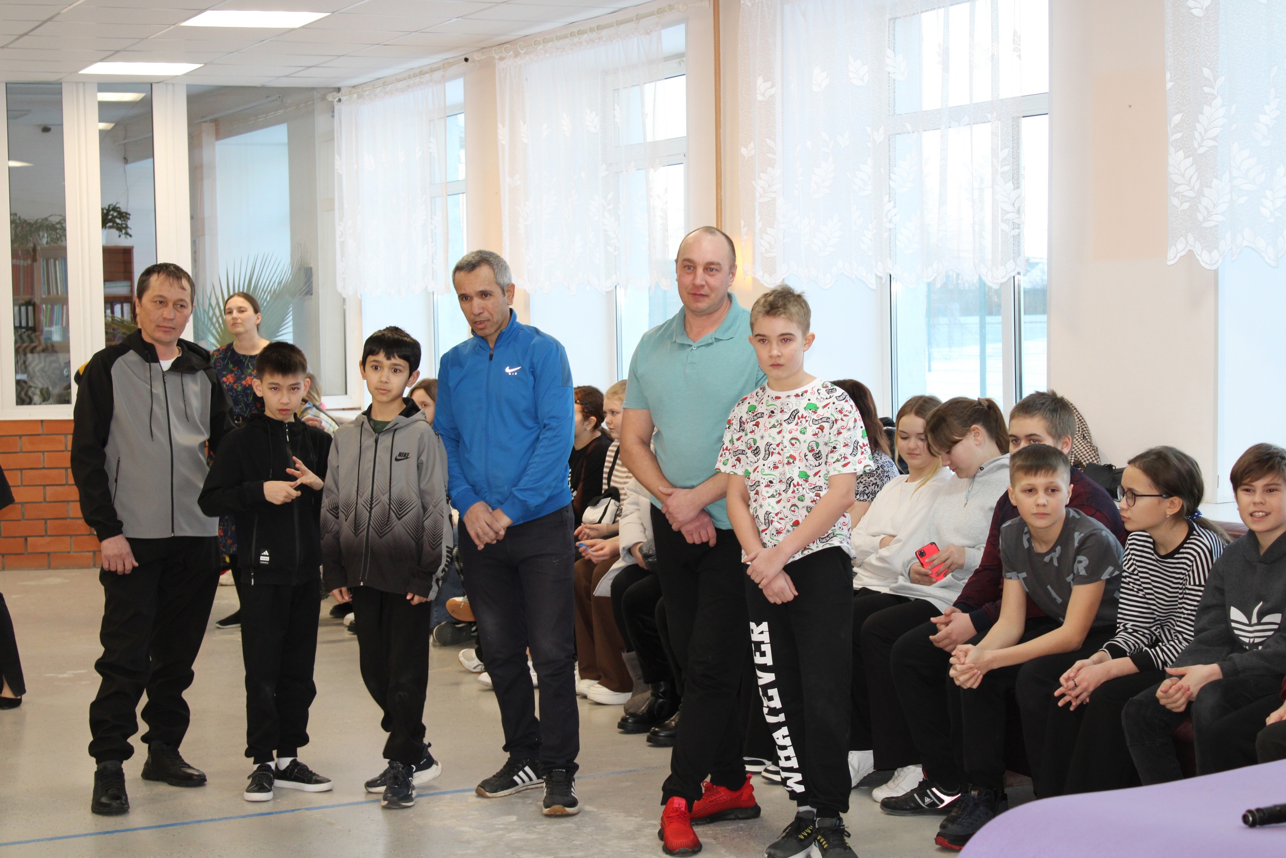 В игре приняли участие ученики 5-6 классов со своими папами и старшими братьями. Смешанные команды взрослых и детей соревновались в быстроте, ловкости, силе и скорости. Проходили препятствия, разбирали и собирали автомат. Все, конечно же, справились и остались довольны.