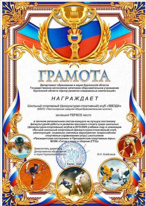 В 2020 году наш ШСК «Звезда» принял участие во Всероссийском смотре-конкурсе на лучшую постановку физкультурной работы и развитие массового спорта среди школьных спортивных клубов в 2019-2020 учебном году в номинации «Лучший школьный спортивный клуб, реализующий социально значимые мероприятия: всероссийские спортивные соревнования (игры) школьников «Президентские состязания» и «Президентские спортивные игры», ВФСК «Готов к труду и обороне» (ГТО).